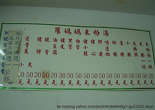 在羅媽媽對面,還有一家黃媽媽米粉湯,兩家就像說好一樣休假日會錯開,不管哪一天想吃米粉湯總可以吃到一家,不至於空跑一趟。事實上,兩家我也都吃過,口味相當(唯一差別是羅媽媽專營米粉湯和豬內臟,下圖是菜牌,而黃媽媽則還有兼賣其他菜點),只是因個人的習慣問題,所以只要羅媽媽有開,我通常都會選擇羅媽媽。