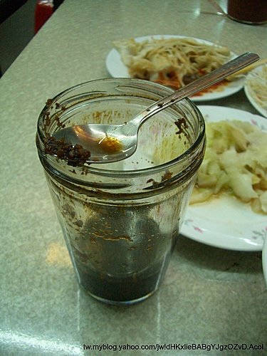 這就是店家自調的蒜頭醬油,因為蒜末經過長時間浸漬,蒜頭辛嗆之氣已予消去,只留下蒜頭的香與甜味,使醬油更加甘醇,搭配米粉湯真是絕配(其實,蒜頭醬油搭配炒米粉、鍋貼...等,也是非常對味,像內湖來來豆漿店的鍋貼,也是配這來吃特別香,有機會再介紹...)